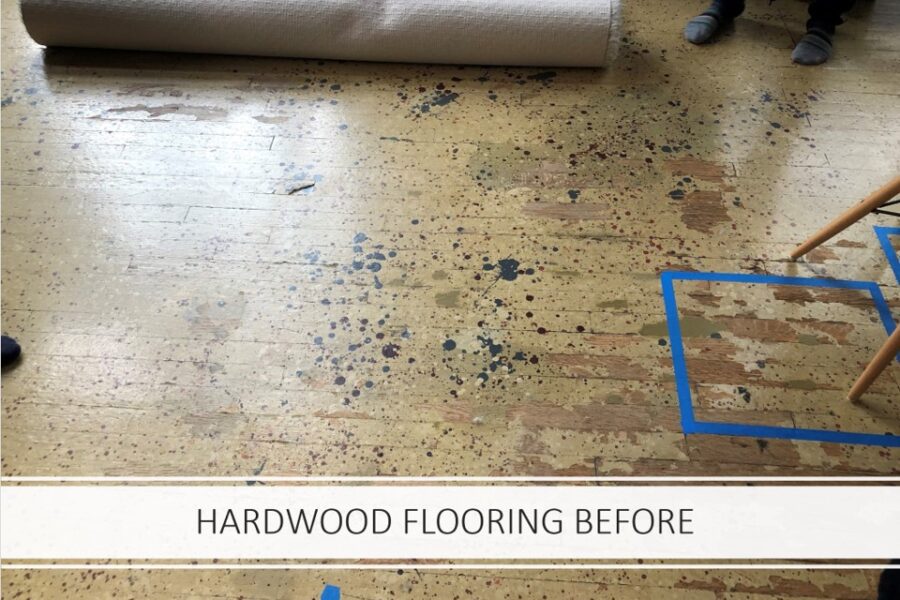 They used the large wooden window panels to hang up art and other creative work. Which was also used to display artwork on the other side, so the neighbors who would walk by got to enjoy this as well. Unfortunately, they painted over the original oak floorboards, and would also be totally careless when it came to rinsing off and drying paint brushes: paint stains on the floor were everywhere.