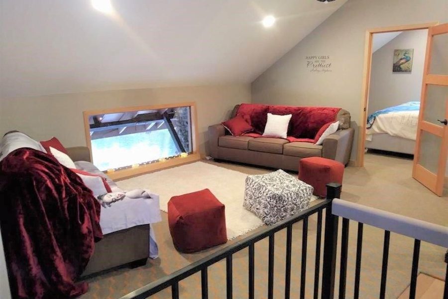 The design goal was to utilize the entire space with several different sitting areas and nooks for cozy gatherings. We decided that using modular and light furniture would create endless options to rearrange the space on any occasion! Upstairs we created three themed bedrooms, a bathroom, and a gathering area for small group conversations or individual assignments.